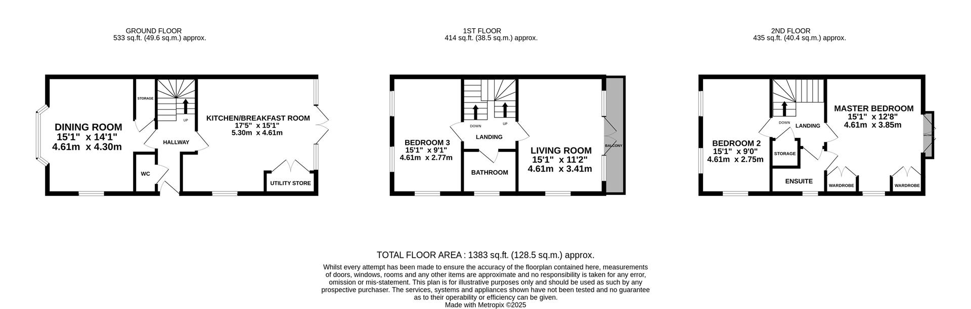 Upon entry, a welcoming hallway gives access to all ground floor rooms. The heart of the home is the kitchen/breakfast room, featuring contemporary units, integrated appliances (fridge/freezer, oven, hob, extractor, dishwasher), space for a dining table, and a utility cupboard housing the washer and dryer. Across the hall is a formal dining room with a bay window, and a guest WC completes this level. The first floor includes a bright living room with floor-to-ceiling windows and French doors leading to a balcony overlooking the garden. A double bedroom and the family bathroom (with bath/shower over, WC and wash basin) are also on this floor. The second floor hosts the master bedroom with built-in wardrobes and Juliette balcony, a further double bedroom, and a shared ‘Jack and Jill’ ensuite shower room.