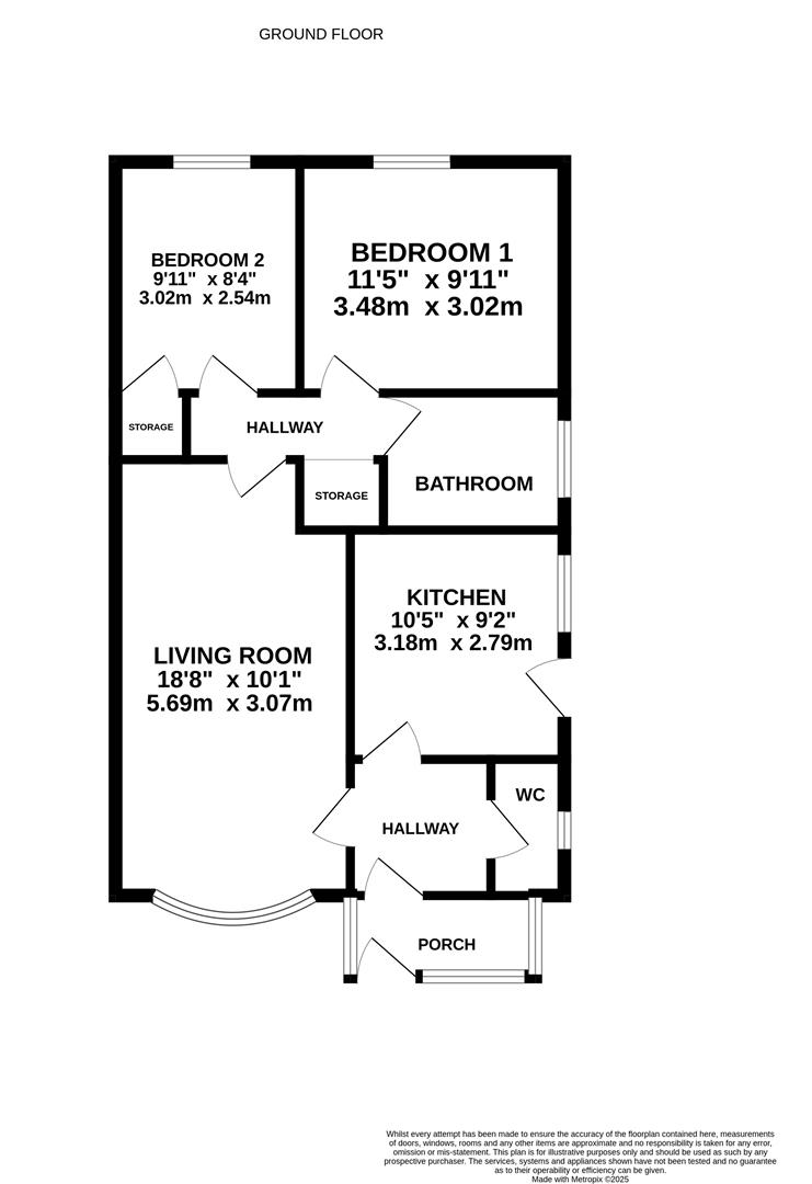 Step into the home via a light-filled entrance porch leading through to a welcoming hallway. The hallway provides access to the kitchen, which is fully fitted with eye and base level units and integrated appliances. The spacious living/dining room enjoys a large bay window to the front, creating a bright and airy living space. From here, an inner hall leads to two comfortable bedrooms, both overlooking the rear garden. The modern family bathroom includes a four-piece suite with a separate shower enclosure and chrome towel rail. A guest WC completes the accommodation.