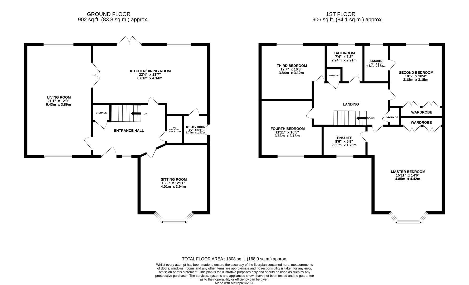 The living room extends the full depth of the home and features an electric fire with surround, dual-aspect windows that allow for an abundance of natural light, and double doors opening into the open-plan kitchen/diner. A further versatile reception room, currently utilised as a second sitting room, enjoys a bay window to the front aspect. The kitchen has been well designed, offering integrated appliances including a double oven, hob, dishwasher, and fridge/freezer, along with a breakfast bar for informal dining. The adjoining utility room provides additional space for appliances and access to the side of the property, where a gravelled area offers potential for a private seating space. There is ample room in the kitchen/diner for a large family dining table, with double doors leading out to the garden. The ground floor is completed by a guest WC. To the first floor are four generously sized bedrooms, two of which benefit from en-suite shower rooms, alongside a three-piece family bathroom. The master bedroom further features built-in wardrobes and a large bay window, enjoying pleasant views over the green space to the front. The loft space is fully boarded with additional shelves for storage and easy stairway access