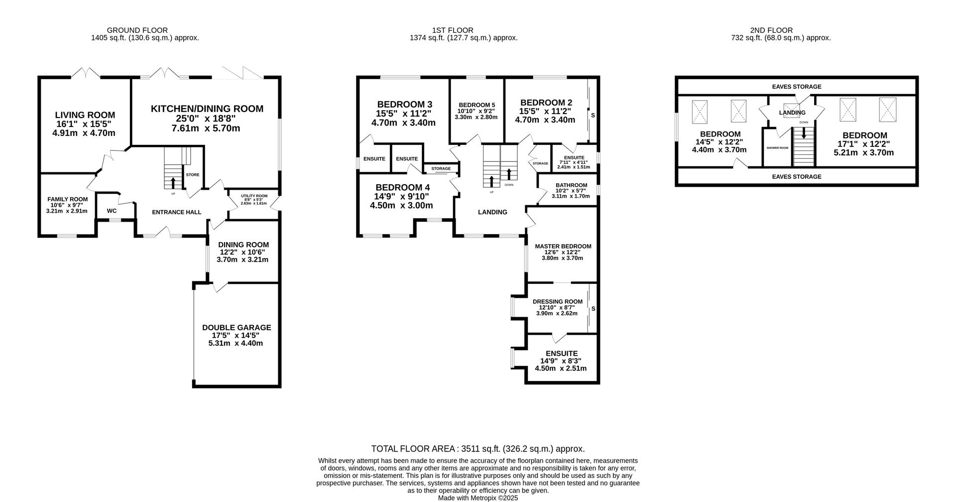 The first floor hosts five spacious double bedrooms, each beautifully presented. The master bedroom is a standout feature, with inset spot lighting and an opening into a dedicated dressing room, fully fitted with wardrobes and drawer units. This in turn leads to a private ensuite shower room, comprising a double shower cubicle, low-level WC, and vanity wash hand basin with under-sink storage. Three further bedrooms on this floor also benefit from their own ensuite shower rooms, offering convenience and privacy for family members or guests. Completing the first floor is a generous family bathroom, fitted with a modern four-piece suite including a bath, separate shower cubicle, low-level WC, and wash hand basin. Rising to the second floor, you will find two further impressively sized double bedrooms and an additional three-piece shower room. This top floor offers the perfect retreat for older children, guests, or even as a private office suite — offering flexible accommodation to suit a range of needs.