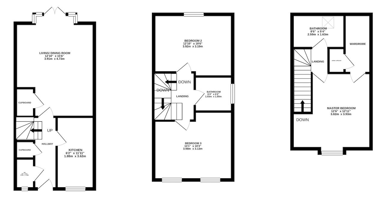 Entry to the property is gained via the entrance hall with doors to access all accommodation and a staircase rising to the first floor landing. The living room extends the full width of the property and will easily accommodate both living and dining furniture. This room also benefits from views and access out to the rear garden via patio doors. Fitted with a range of eye and base level units, the kitchen comprises an integral oven, hob and extractor with space for a washing machine, dishwasher and a fridge/freezer. To complete the ground floor accommodation, there are two built-in storage cupboards and a guest w/c. To the first floor, you will find two double bedrooms and a family bathroom, which is complete with a bath tub, low level w/c and a vanity wash hand basin, whereas the bathroom on the second floor offers a bath tub with a rainfall shower over, vanity wash hand basin and a low level w/c. The generously sized master bedroom is also arranged on the second floor and boasts an impressive walk-in wardrobe.