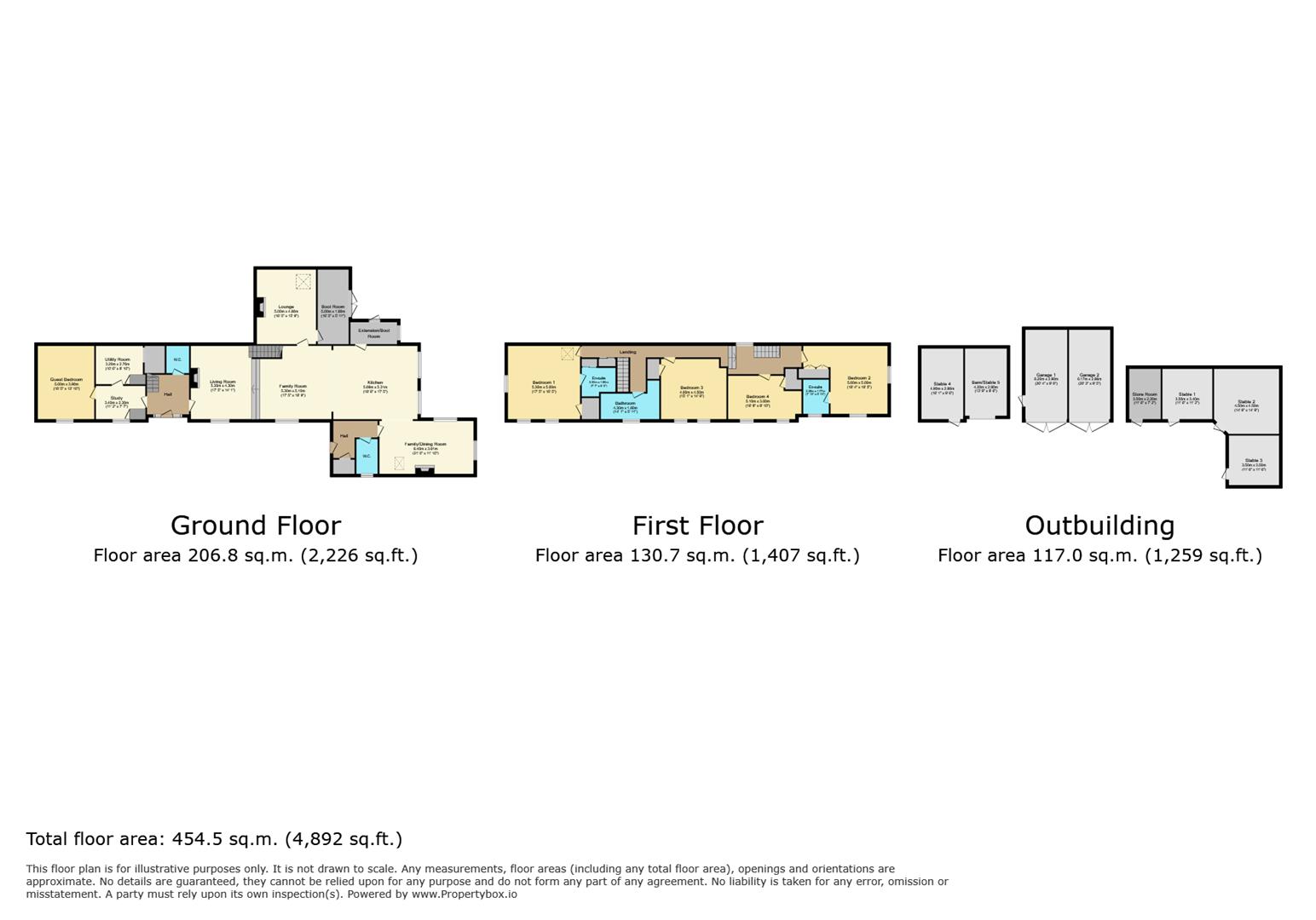 Internally, the immaculately presented accommodation offers generous and versatile living space. The ground floor features a large bespoke open-plan kitchen/breakfast area, multiple reception rooms, a study, utility room, two guest cloakrooms, a boot room, and a guest bedroom. To the first floor, there are four well-proportioned double bedrooms, two benefiting from en-suite shower rooms and three featuring large walk-in wardrobes, alongside a spacious family bathroom.